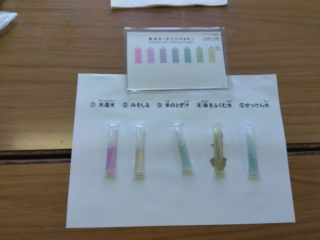 水の汚れを色で見て調べるBODパックテストを使って、私たちの身近にあるものの汚れを調べました。米のとぎ汁や味噌汁など、普段から流している水が実は川や海の汚れになっていることを知っていただきました。
