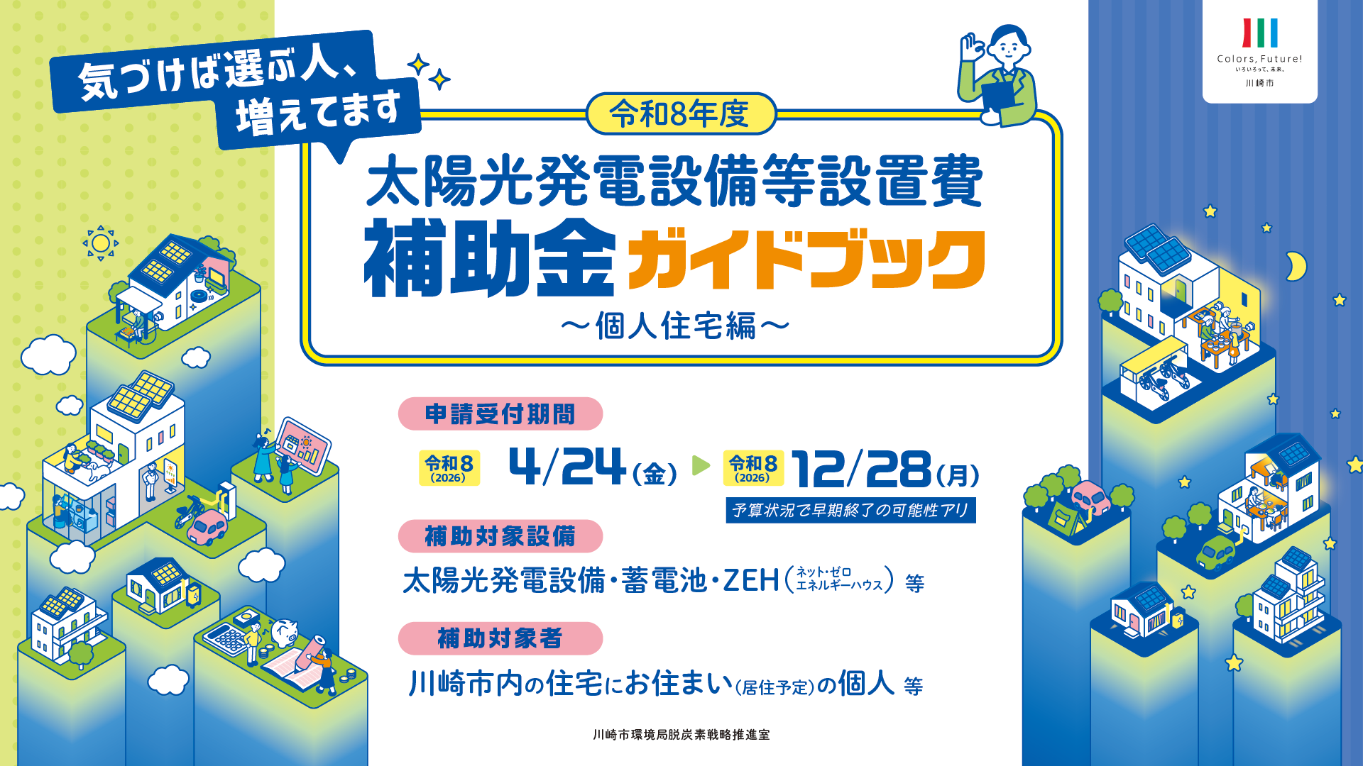 ・詳細は、「川崎市太陽光発電設備等設置費補助金交付要綱」「令和8年度 川崎市太陽光発電設備等設置費補助金申請の手引き~個人住宅編~」「令和8年度 川崎市太陽光発電設備等設置費補助金申請の手引き~共同住宅編~」をご確認ください。