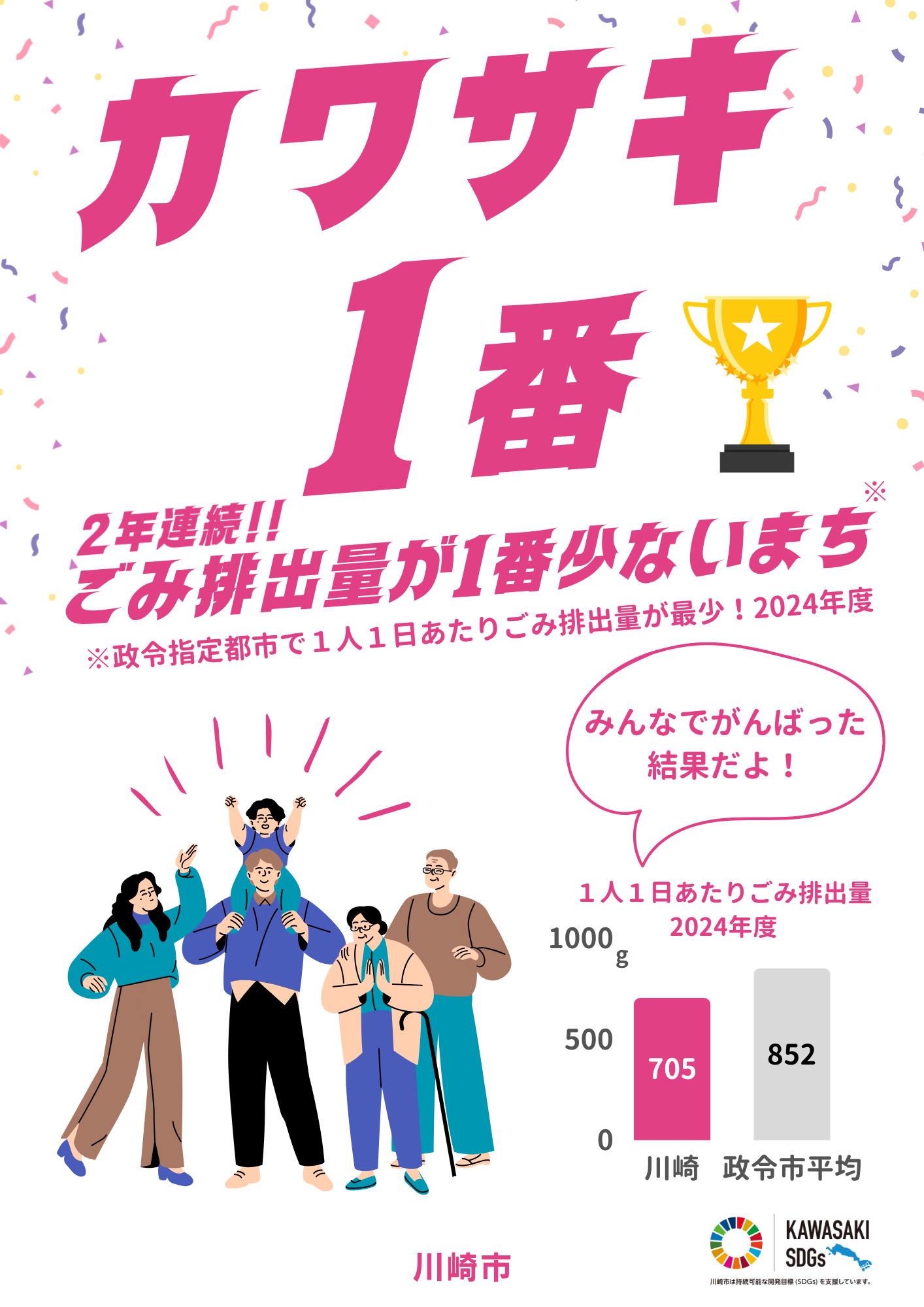 川崎市は、政令指定都市の中で1人1日当たりのごみ排出量が2年連続で最も少ないまちです。