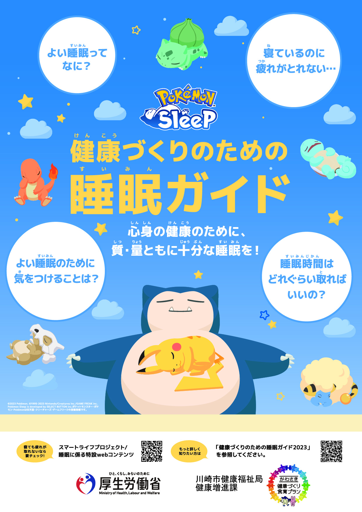 健康づくりのための睡眠ガイド(ポケモン)(PDF, 448.96KB)別ウィンドウで開く睡眠に関する普及啓発用に『Pokémon Sleep』に登場するポケモンを起用したリーフレットを作成しております。