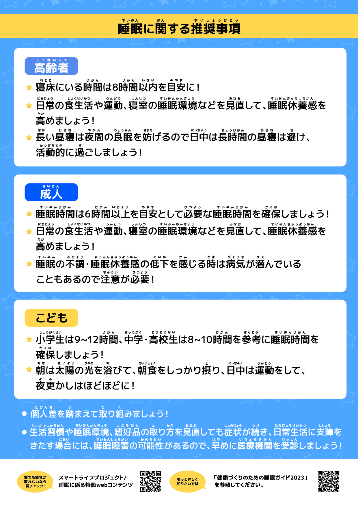 GoodSleepガイド(ぐっすりガイド)成人版(PDF形式, 1008.40KB)別ウィンドウで開く成人を対象に良質な睡眠をとるための参考となる情報をまとめています。印刷して3つ折りにしてご活用ください。(厚生労働省作成)
