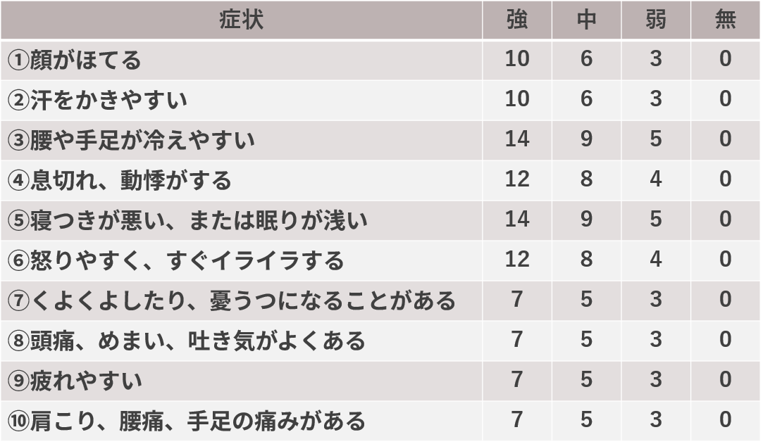 更年期症状も「疲れやすい」「肩こり・腰痛・手足の痛みがある」「汗をかきやすい」「腰や手足が冷えやすい」「怒りやすく、すぐイライラする」「寝付きが悪い、眠りが浅い」などさまざまで、症状の程度も個人差が大きいといわれています。