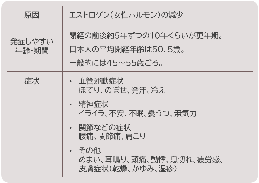 卵巣機能の低下による女性ホルモンの減少が主な原因ですが、それ以外にも、性格や体質、環境的な要因などが更年期症状の現れ方に関係していると言われています。