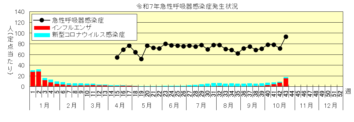 ・令和7年第43週の急性呼吸器感染症の定点当たり報告数は93.49人(71.85人)でした。カッコ内は前週の数値となっています。