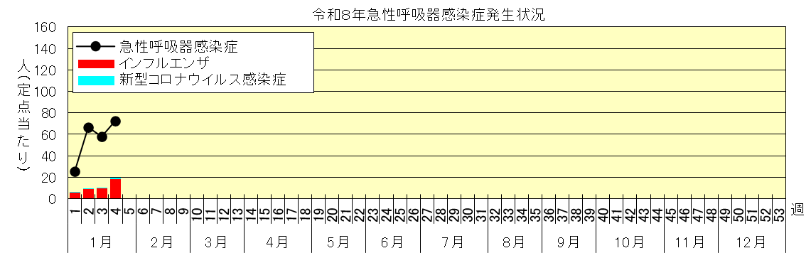・令和8年第4週の急性呼吸器感染症の定点当たり報告数は72.73人(58.03人)でした。カッコ内は前週の数値となっています。