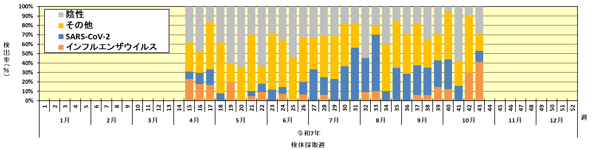 ・令和7年第43週に採取された検体(17検体)からはインフルエンザウイルスが7件(41.2%)、SARS-CoV-2が2件(11.8%)、その他が3件(17.6%)検出されています。(令和7年10月29日時点)