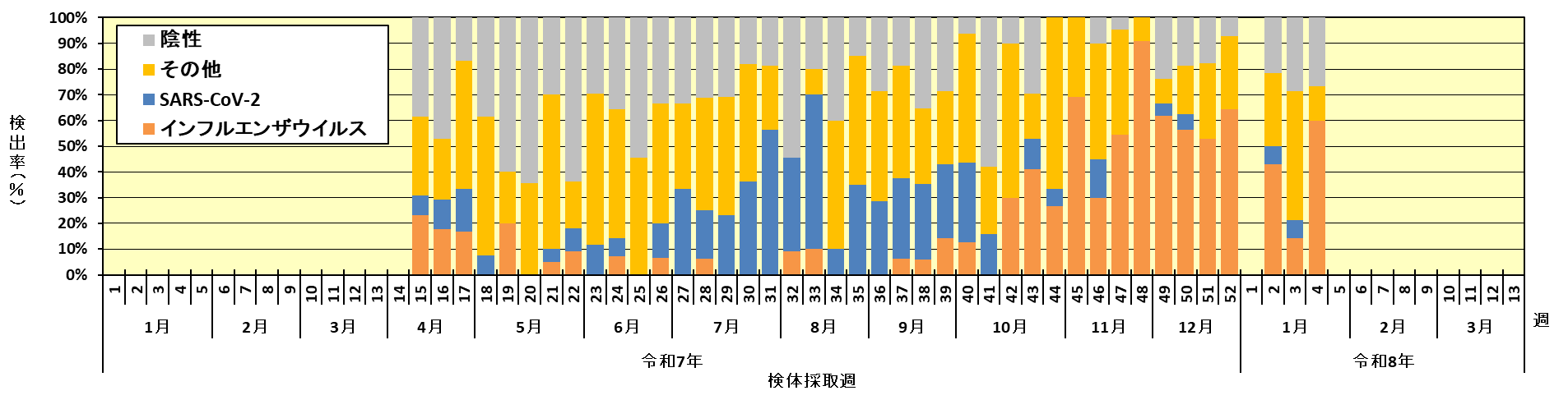 ・令和8年第4週に採取された検体(15検体)からはインフルエンザウイルスが9件(60.00%)、SARS-CoV-2が0件(0.00%)、その他が2件(13.33%)検出されています。(令和8年1月28日時点)