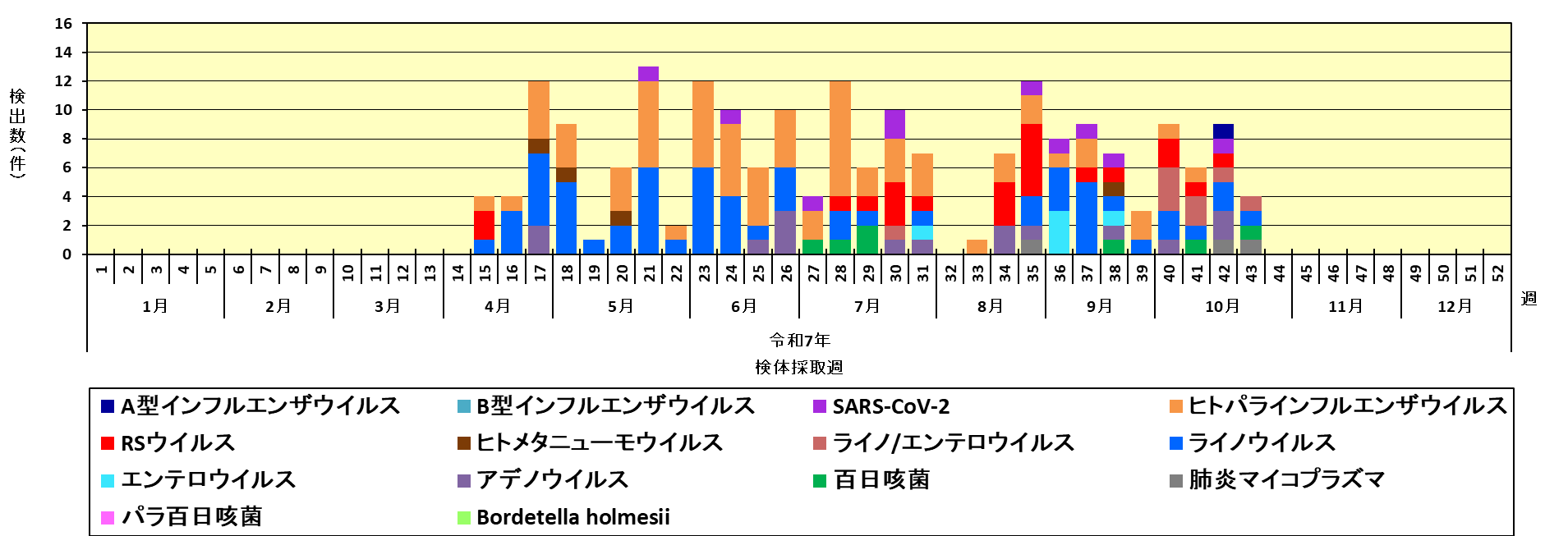 ・令和7年第43週に採取された検体の検査結果「その他」の内訳は、ライノウイルスが1件、肺炎マイコプラズマが1件、ライノウイルス/エンテロウイルス及び百日咳菌が1件です。(令和7年10月29日時点)