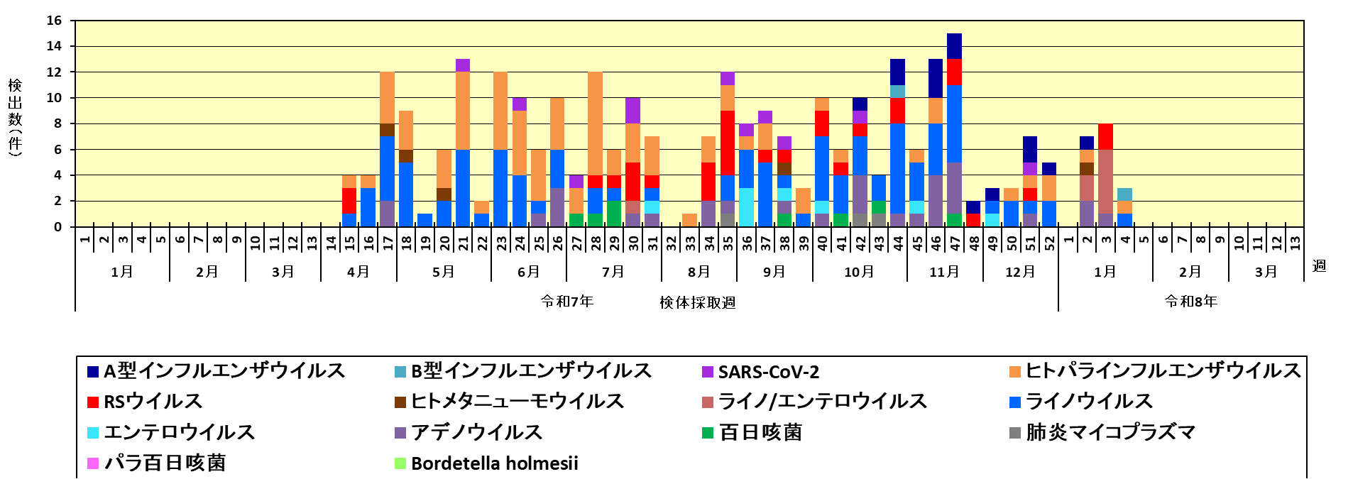 ・令和8年第4週に採取された検体の検査結果「その他」の内訳は、ライノウイルス、B型インフルエンザウイルスが1件、ヒトパラインフルエンザウイルスが1件です。(令和8年1月28日時点)