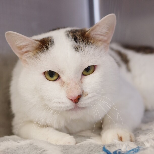 性格 | 白キジ柄の男の子です。おやつが大好きで、もらうと嬉しそうにきれいに食べきる姿がとても愛らしいです。玩具遊ぶことも好きで、とくに羽根つきのおもちゃを使った遊びには積極的に参加してくれます。ただし、まだ人に触れられることには慣れておらず、触ろうとすると逃げようとしたり、「シャー」と声を出したりします。