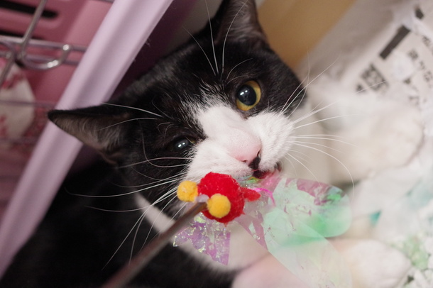 | 性格 | しらたきは、まだ人に馴れる練習をしている控えめな女の子です。人に触られることはまだ苦手ですが、少しずつ距離を縮めるきっかけが見えてきています。おもちゃで遊ぶことやおやつが好きな様子で、とくに羽根つきのおもちゃにはとても良い反応を見せてくれます。遊びを通して心を開いていく姿は、これからの成長を楽しみにできるポイントです。しらたきのペースに合わせて、やさしく見守ってくださる方との出会いをお待ちしています。