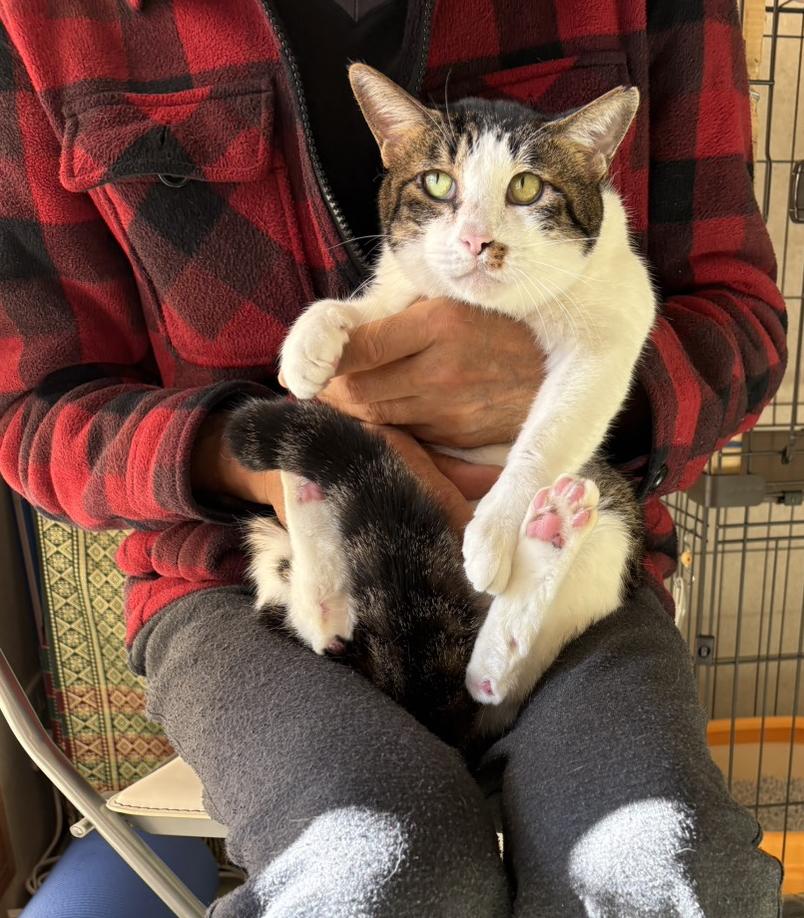 | 性格 | キジ白の模様がやさしい印象の子で、人に程よく馴れています。触れることを受け入れてくれ、ブラッシングをしていると落ち着いた様子を見せてくれます。抱っこを許してくれる場面もあり、人との関わりを前向きに楽しめるタイプです。おやつやおもちゃにも興味を示し、その時々でさまざまな表情を見せてくれるところが魅力です。穏やかさと柔らかい雰囲気をあわせもつ子ですので、生活の中で自然と距離が縮まっていくでしょう。