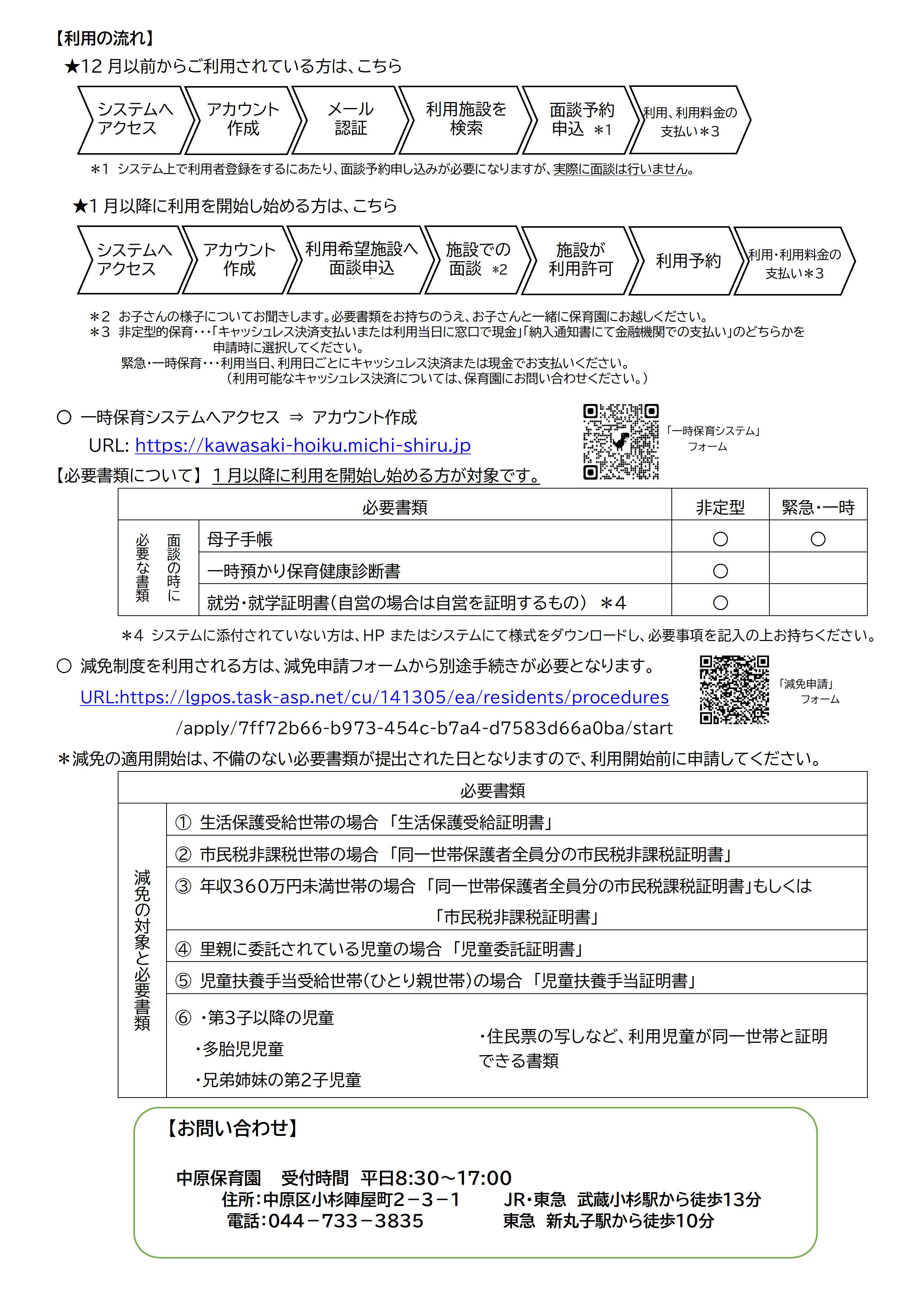 また、川崎市一時保育システム以外で利用予約(1月31日までに予約)をされた方は、直接、保育園まで電話(044-712-3289)でご連絡ください。
