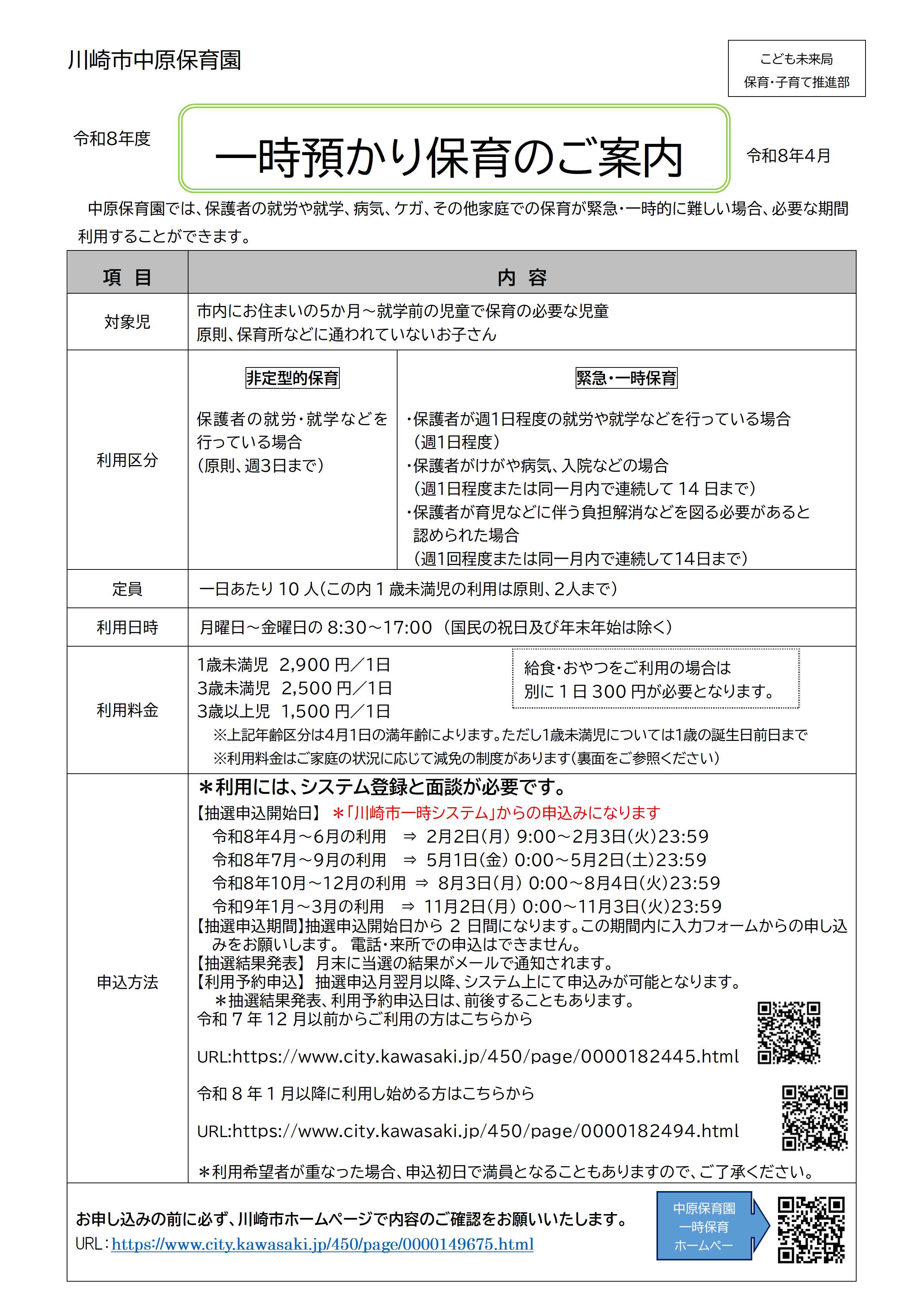 利用料の減免を受けられる場合がありますので、くわしくは川崎市「一時保育」をご覧ください。