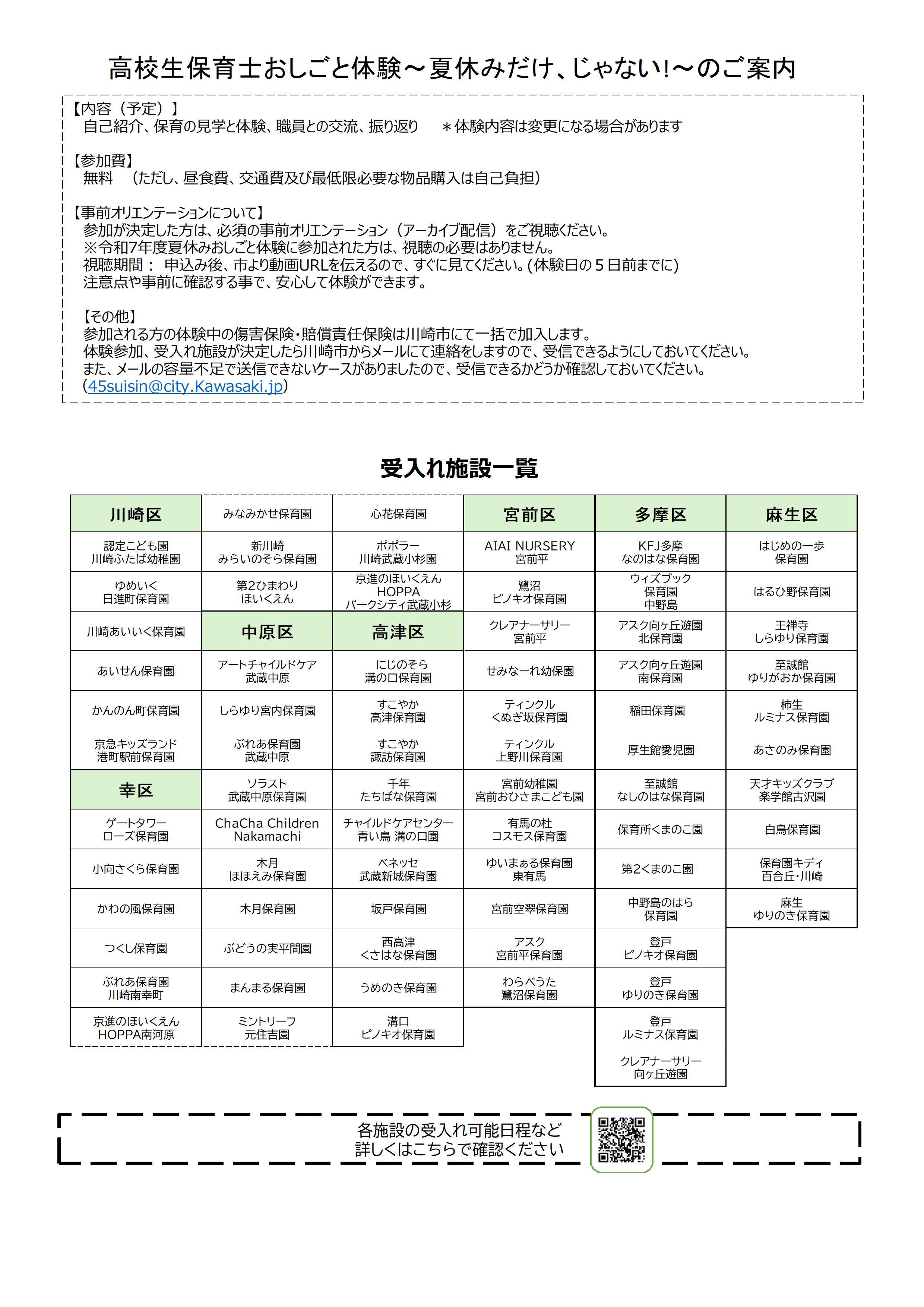 川崎市内の受入れ可能な保育施設 詳細はこちら