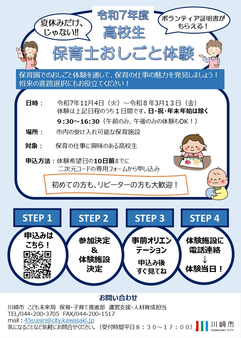 川崎市内の保育園で保育士体験ができる「高校生保育士おしごと体験」に参加しませんか?