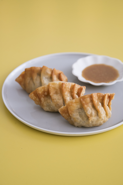 | 4 | 餃子の皮の中央に具をのせ、周りを水(分量外)でぬらし、二つに折り、合わせ目を指で押さえて閉じる。 |