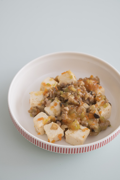 保育園向けに辛味を使わず作った、やさしい味の麻婆豆腐。ほどよいとろみで具材がまとまり、豆腐も挽肉も食べやすい仕上がりです。