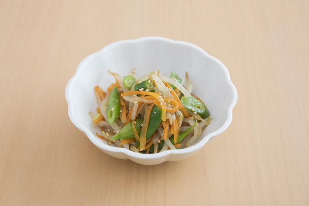 もやし・いんげん・にんじんをせん切りにして和えた、彩りのきれいなおかずです。胡麻油の香りと、シャキッとした食感が楽しめます。