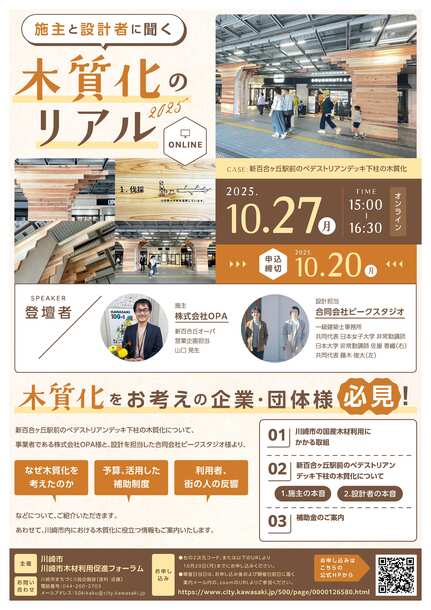 今回のWEBセミナーでは、新百合ヶ丘駅前のペデストリアンデッキ下柱の木質化について、事業者である株式会社OPA様と、設計を担当した合同会社ピークスタジオ様より、