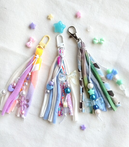 Tシャツヤーンとチャームを組み合わせたオリジナルのキーホルダーづくりができるよ!