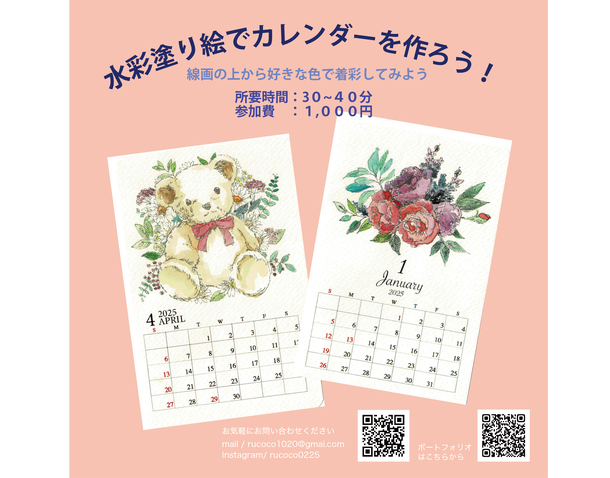 花や動物の線画に合わせて水彩カレンダーを作成します。色も塗り方も自分の好きなアレンジでOK。