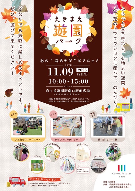 今年春の初開催に引き続き、向ヶ丘遊園駅南口駅前広場(多摩区登戸2737外)の車道の一部を歩行者天国とし、秋を感じながらピクニックや各種クラフト制作、薪割り等の体験ができる、公共空間の利活用実験「えきまえ遊園パーク」を11月9日(日)に開催します。開催にあたっては、日鉄興和不動産株式会社、小田急不動産株式会社より、運営負担の一部を支援いただくとともに、専修大学ワークショップを同日に開催するなど、産官学が連携して取り組みます。