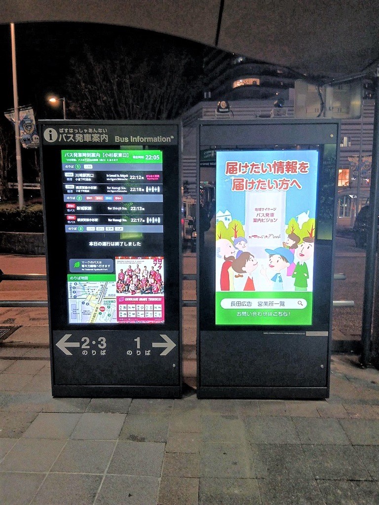 武蔵小杉駅東口に同駅東口から発車する全路線バス(川崎市バス、東急バス、川崎鶴見臨港バス等)の発車案内や位置情報(リアルタイム)等を発信するバス案内デジタルサイネージを設置しました。