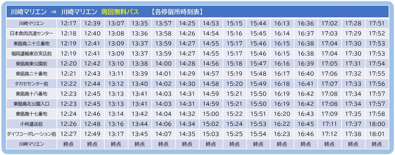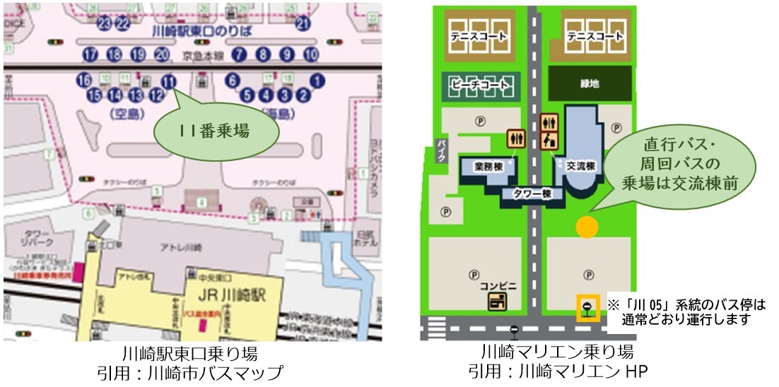 川崎マリエン交流棟前の新設バス停から川05系統と同じ停留所へ停車し、川崎マリエンまで1周します(東扇島西公園方面は運行しません。)。
