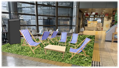 - マリエン交流棟1階にアウトドア仕様の椅子、テーブルやバス時刻表、施設紹介、イベント情報等を表示するデジタルサイネージを設置し、快適な乗換環境を整備