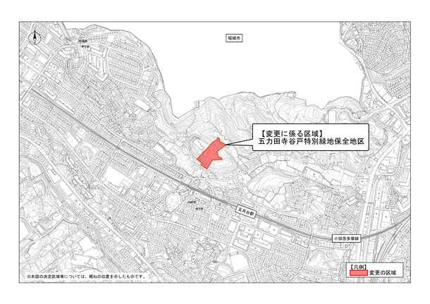 本案のうち、「五力田寺谷戸特別緑地保全地区」は、麻生区五力田の市街化調整区域内に位置し、広域的な緑のネットワークを形成する多摩丘陵を構成する緑地となっています。また、当地区は周辺の里地景観を構成する要素の1つとして、優れた景観を形成するとともに、多様な動植物の生育・生息空間となっています。以上のことから、都市緑地法第12条第1項第3号ロに該当し、かつ、住民の健全な生活環境を確保するために必要なものとして、区域を変更するものです。