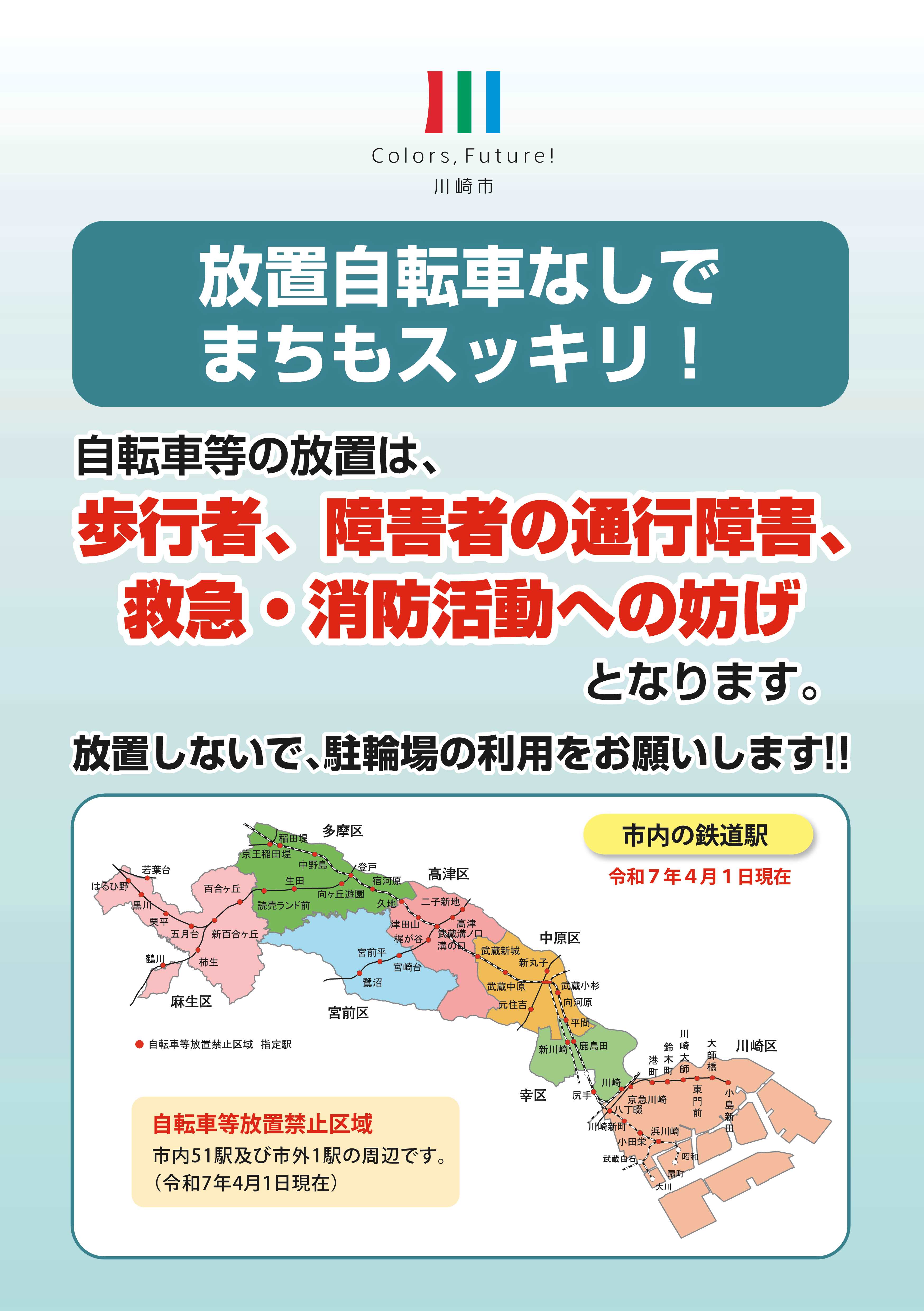 川崎市では、昭和62年10月に「川崎市自転車等の放置防止に関する条例」を制定し自転車等放置禁止区域を設定するなど、この問題に取り組んできました。しかし、「放置自転車等放置ゼロ」を実現するには皆さんの御協力が不可欠です。