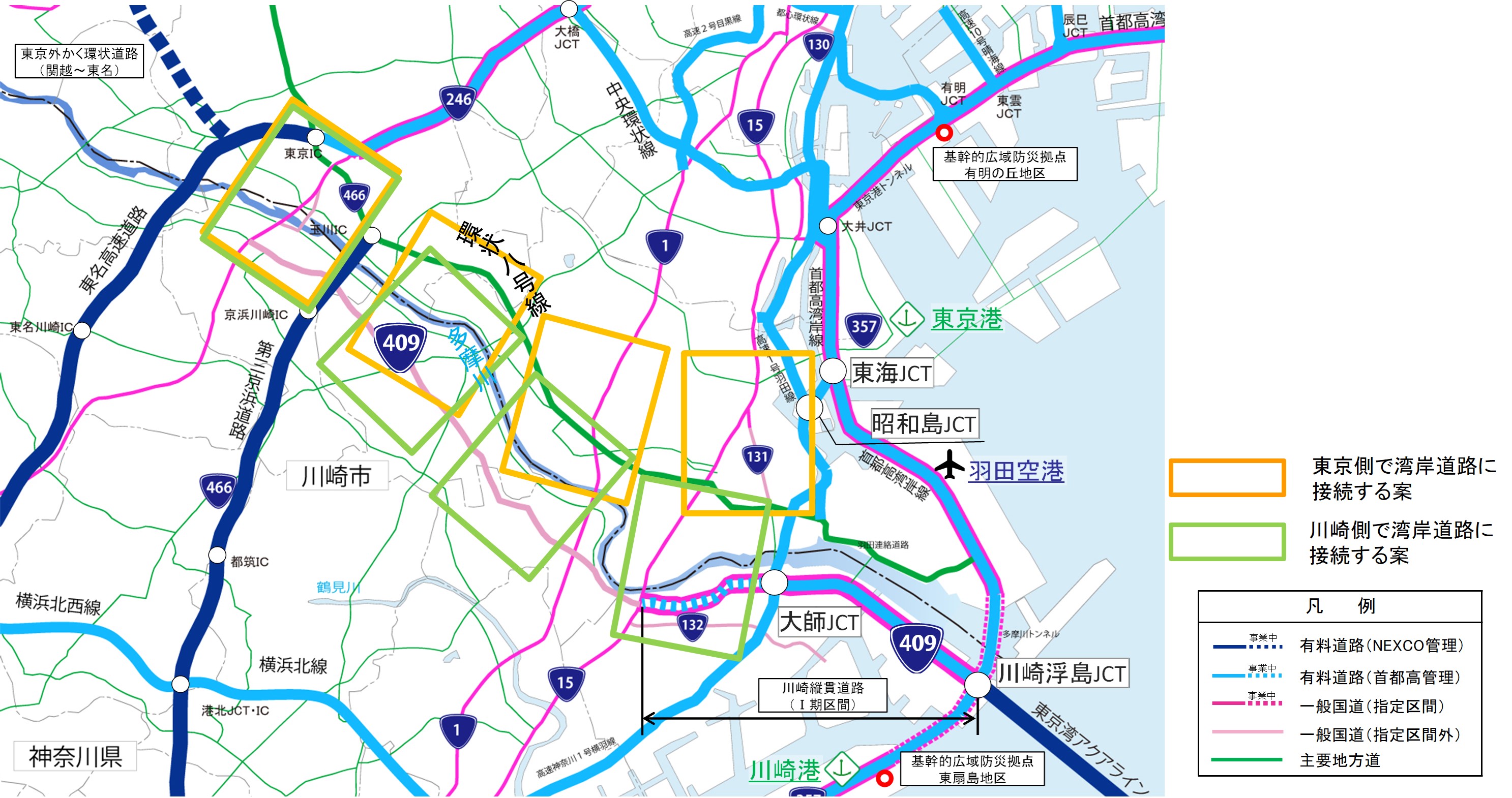 自動車専用部については、平成22年10月に川崎浮島ジャンクション~大師ジャンクション間が開通しましたが、大師ジャンクション以西については、2期区間等の見通しを考慮しつつ、採算性確保策を検討するとされ、整備が先送りされております。