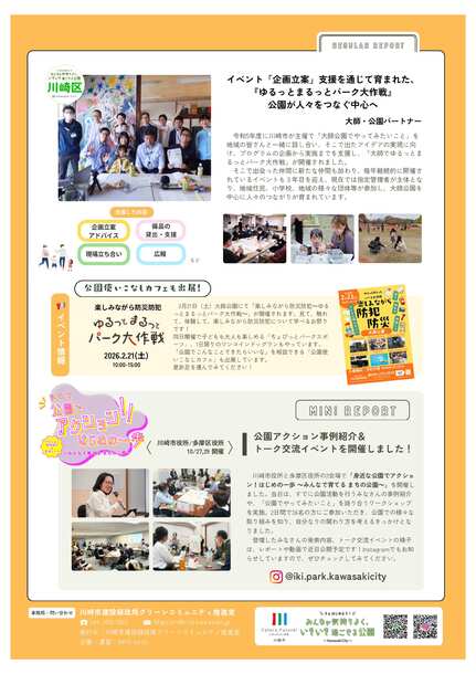 令和7年9月に宮崎第4公園(宮前区)、11月には菅北浦緑地(多摩区)と餅坂第5公園(麻生区)において、公園をもっと身近に感じ、気軽に関わるきっかけづくりとして「イドバタパークデイ」※1を実施しました。