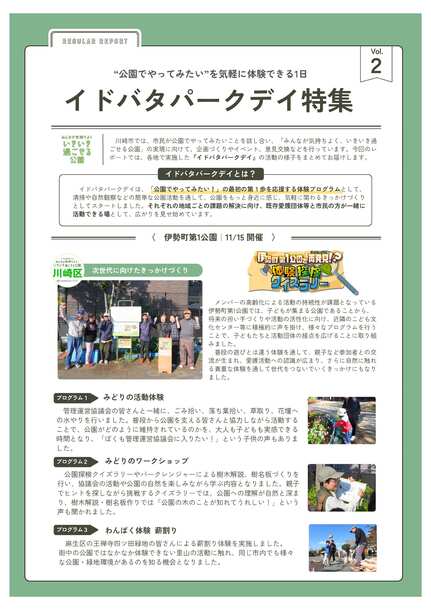 その取組内容の報告として「みんなが気持ちよく、いきいき過ごせる公園」レポート第14弾(イドバタパークデイ特集)にとりまとめました。このレポートは市ホームページでも公開しています。
