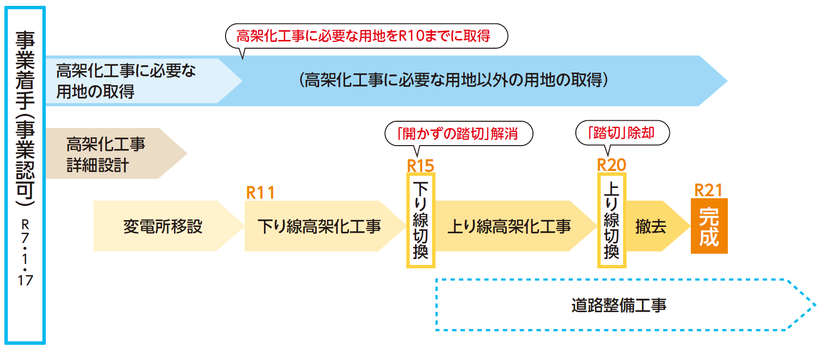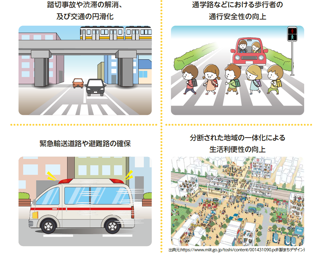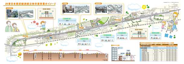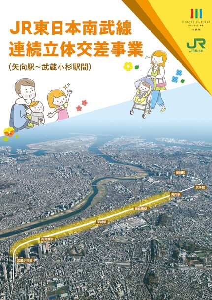 本事業は、JR東日本南武線の矢向駅~武蔵小杉駅間の約4.5kmにおいて鉄道を高架化することにより、9箇所の踏切を除却し、踏切に起因する事故や渋滞を解消することで地域交通の安全性・円滑化等の構造を図るとともに、分断された地域の一体化による生活利便性の向上を図り、誰もが安心して暮らしやすく、災害に強いまちづくりを推進してまいります。