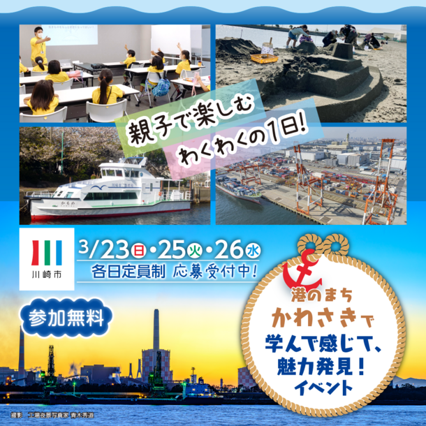 川崎の次世代を担う子どもたちに川崎港を身近に感じ、親しみを持ってもらうため、「港のまち かわさきで学んで感じて、魅力発見!イベント」を開催します。このイベントでは、市の巡視船に乗って川崎港を見学したり、臨海部に立地する企業から川崎港の今と未来の取組を学んだり、市内唯一の人工海浜でサンドアートを楽しんだりすることができます。産業の一大集積地として歴史ある川崎港は、「はたらく港」としてたくさんの人々の生活を支える工業エリアです。一方、昨今では日本夜景遺産に登録された工場夜景の他、週末にはエリア内の公園で海釣りやバーベキュー、サッカーなどのレジャーで賑わい、「遊べる港」としての利用もあります。ぜひ川崎港へお越しください。