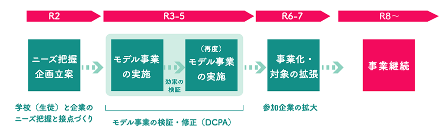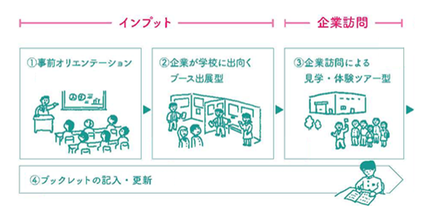 これは、企業訪問(「見学・体験ツアー型」)を軸に、インプットからアウトプットまでの一連の学びを年間を通して学校と企業が連携しながら行っていきます。