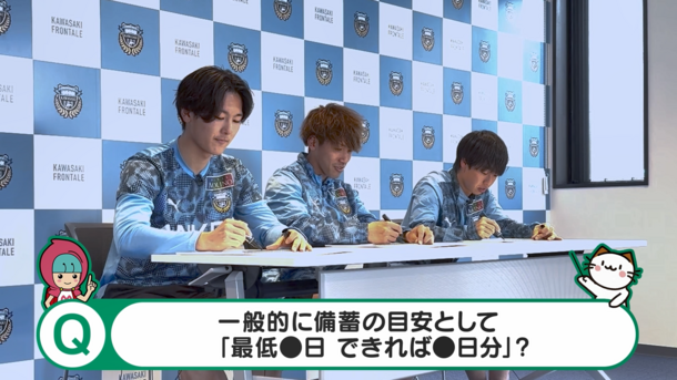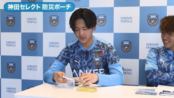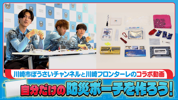 川崎フロンターレとの連携による防災啓発の取組として、前年度に引き続き今年度も同クラブ選手出演の防災啓発動画を2本公開しました。1本目は在宅避難をテーマにしたクイズ動画「第2回川崎フロンターレ防災王決定戦!」、2本目は外出先での被災に備える「自分だけの防災ポーチを作ろう!」。選手がクイズ形式で防災の知識を学ぶ様子や、オリジナルの防災ポーチを実際に作っている様子が御覧いただけます。