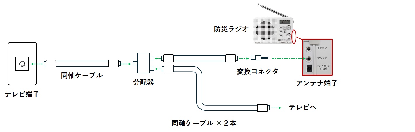 壁のテレビ端子と分配器を同軸ケーブルで接続し、分配器に防災ラジオとテレビを接続してください。