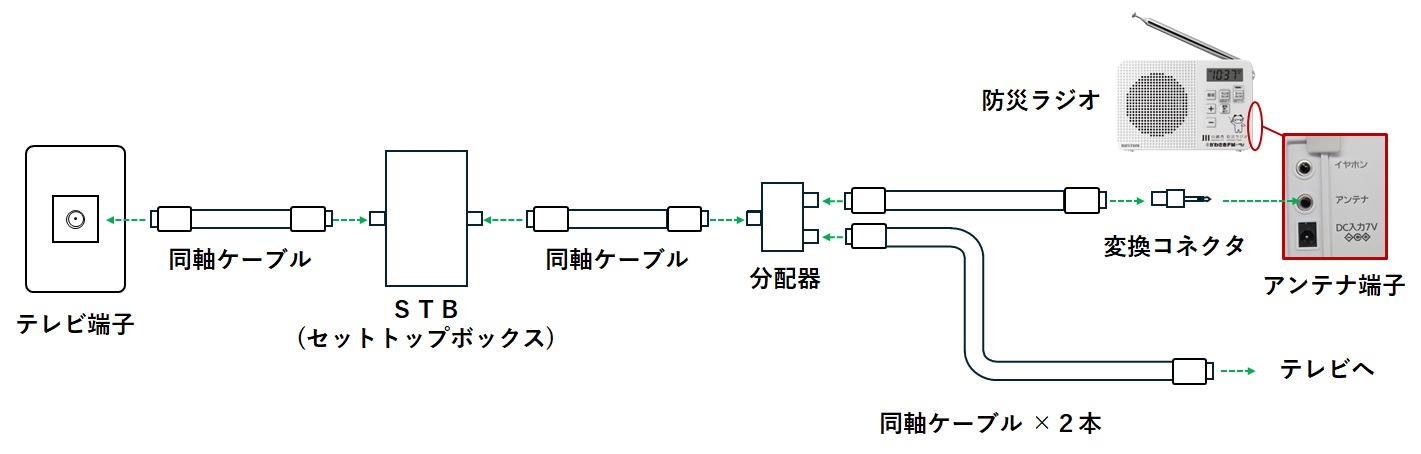 STBと分配器を同軸ケーブルで接続し、分配器に防災ラジオとテレビを接続してください。
