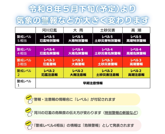 令和8年5月下旬(予定)から新たな防災気象情報の運用が開始されます。