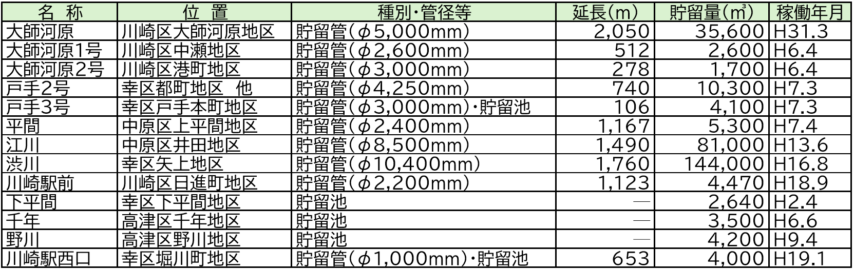 川崎市内には計13箇所の貯留管・貯留池があり、市内各地で効果を発揮しています。
