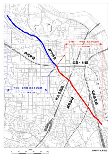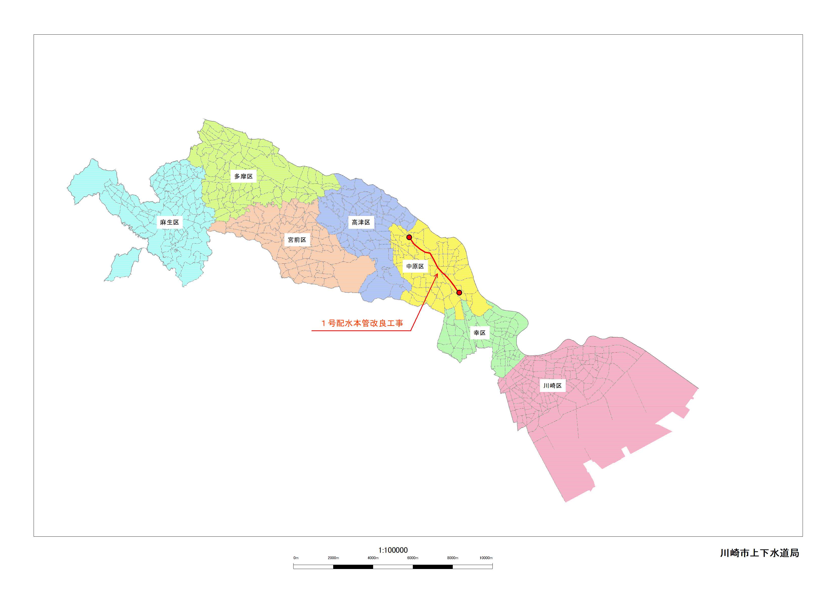 この工事は、基幹管路である1号配水本管(直径1メートル)の更新を約4.0キロメートル行うものです。周辺環境を考慮し、開削工法ではなくPIP(パイプ・イン・パイプ)工法で施工を進めています。工事場所と施工状況は次の通りです。