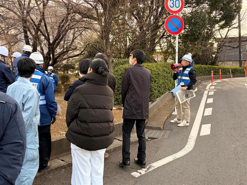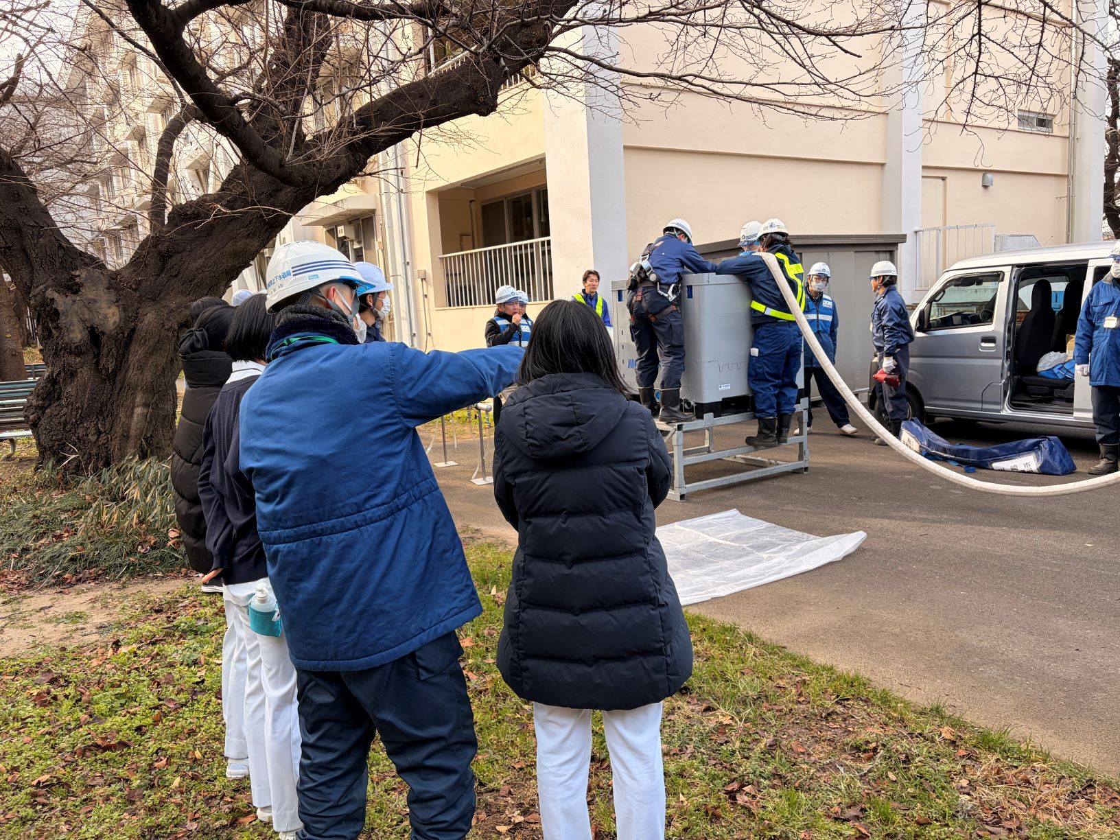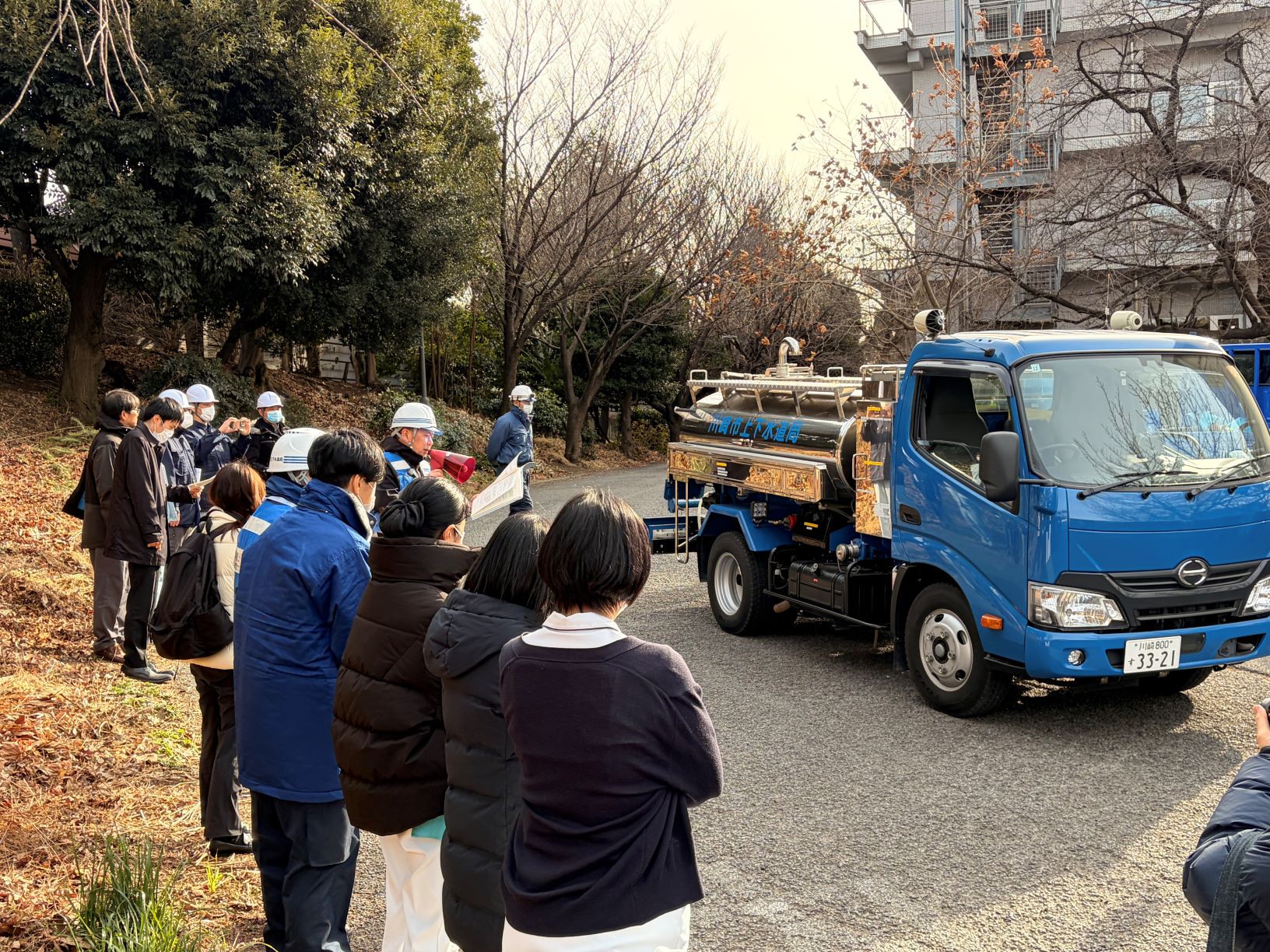 川崎市上下水道局では、大規模地震等の災害時において重要な医療機関への応急給水の実施に備え、毎年、情報伝達、応急給水活動について、医療機関と合同訓練を実施しています。今年度2回目となる合同給水訓練として、令和8年1月26日に災害時のけがをした人の受入れ先となっている虎の門病院分院(高津区)と合同で、通信訓練と応急給水訓練を実施し、円滑な体制の構築を目指すとともに、災害対応能力の強化を図りました。