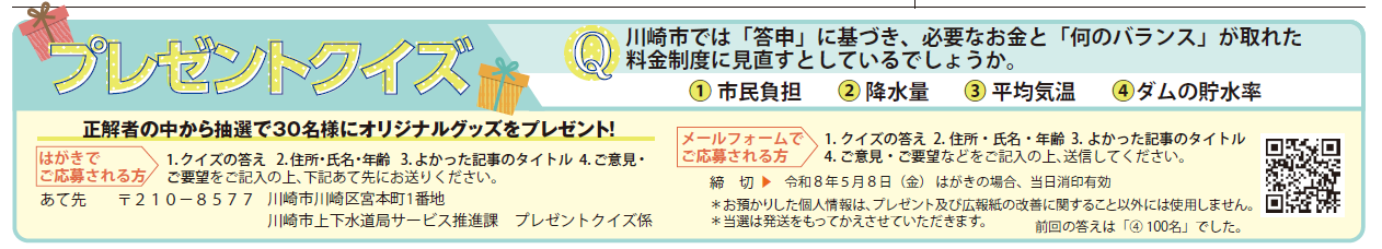 「かわさきの上下水道」では、毎号プレゼントクイズを実施しています。