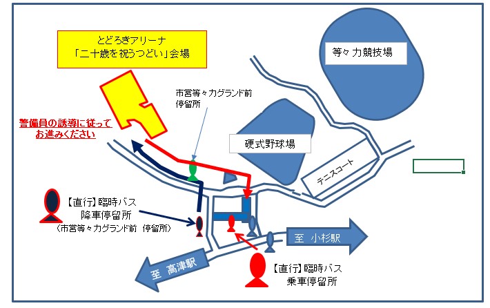 令和8年1月12日(月)成人の日に、令和8年川崎市「二十歳を祝うつどい」がとどろきアリーナで開催されるのに伴い、直行臨時バス(小杉駅~等々力グランド)を運行します。