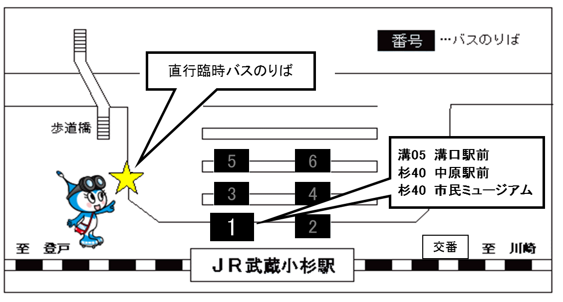 小杉駅前 1番のりば | 溝05 溝口駅前行き 杉40 中原駅前行き 杉40 市民ミュージアム行き | 小杉駅前→市営等々力グランド入口はこちら外部リンク 市営等々力グランド入口→小杉駅前はこちら外部リンク |