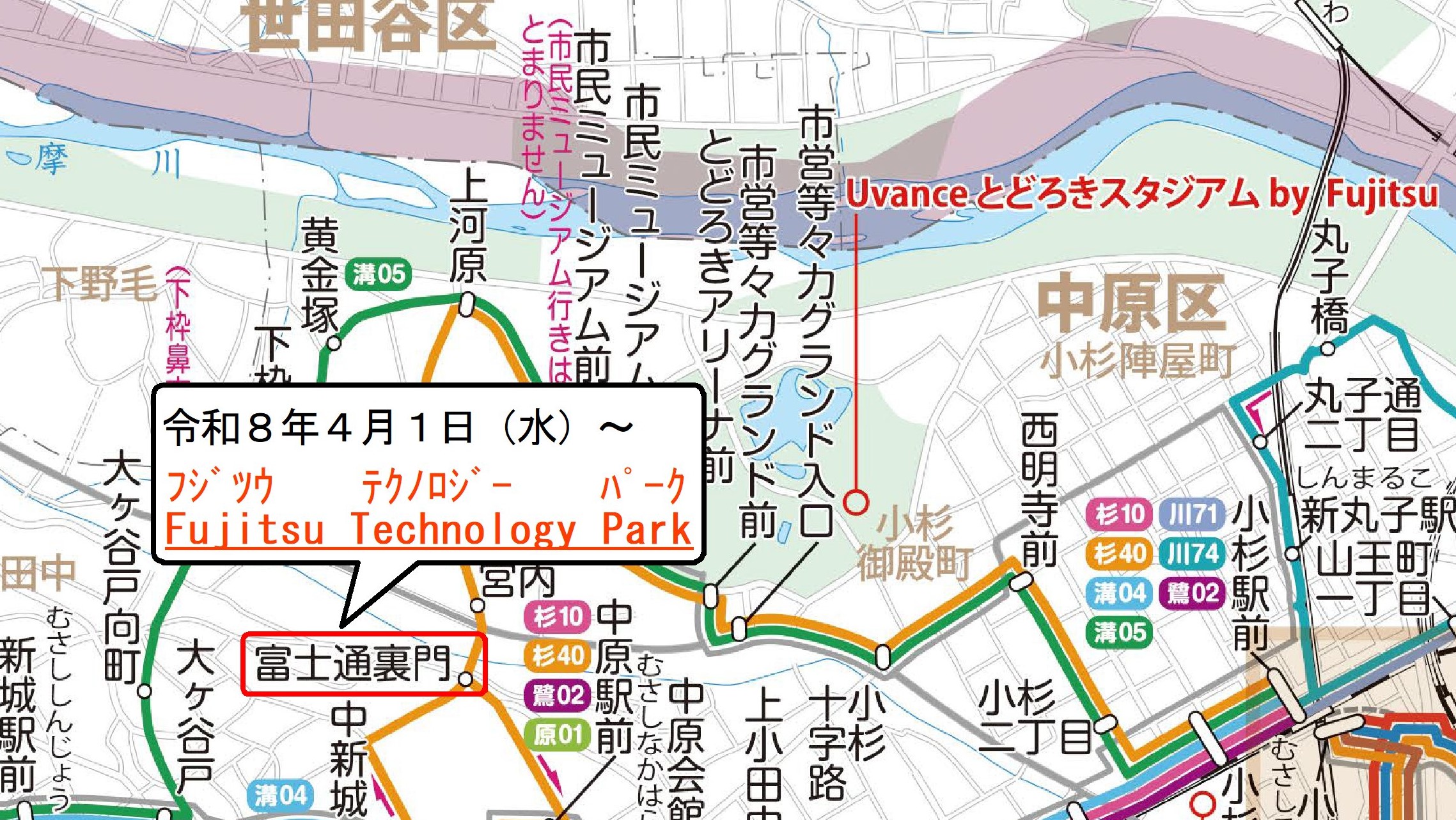 「富士通裏門」停留所の名称を「Fujitsu Technology Park」に変更します