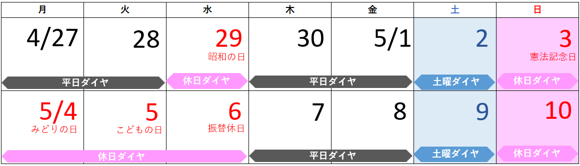 【お知らせ】大型連休期間(4月29日~5月6日)は暦どおりの運行となります
